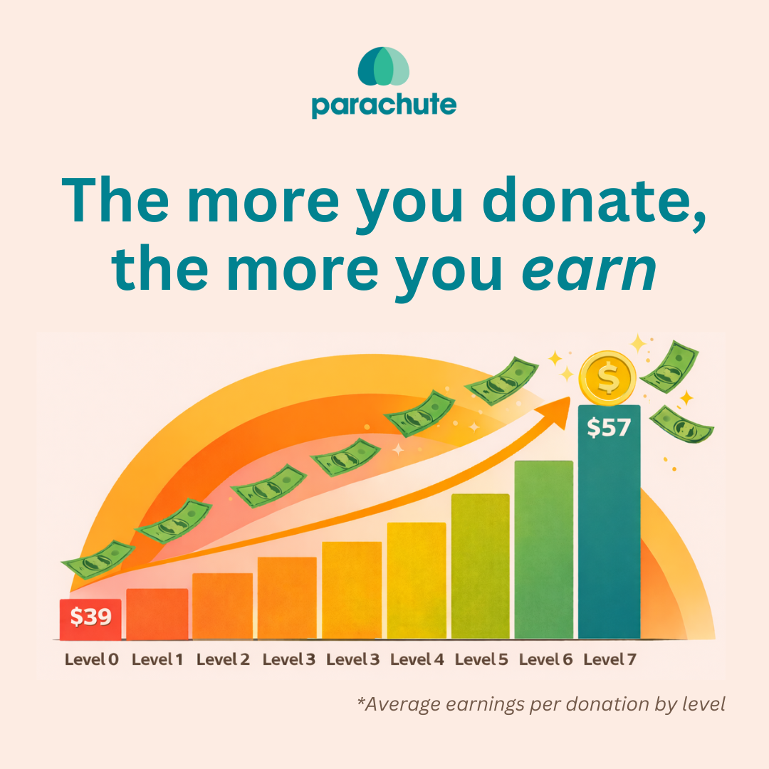 Parachute rewards consistency and reliability. Levels: The more often you donate, the higher your base pay gets. Parachute rewards consistency. Power-Ups: Bonus opportunities that stack on top of your base pay. Instead of one hard-to-hit bonus, ...
