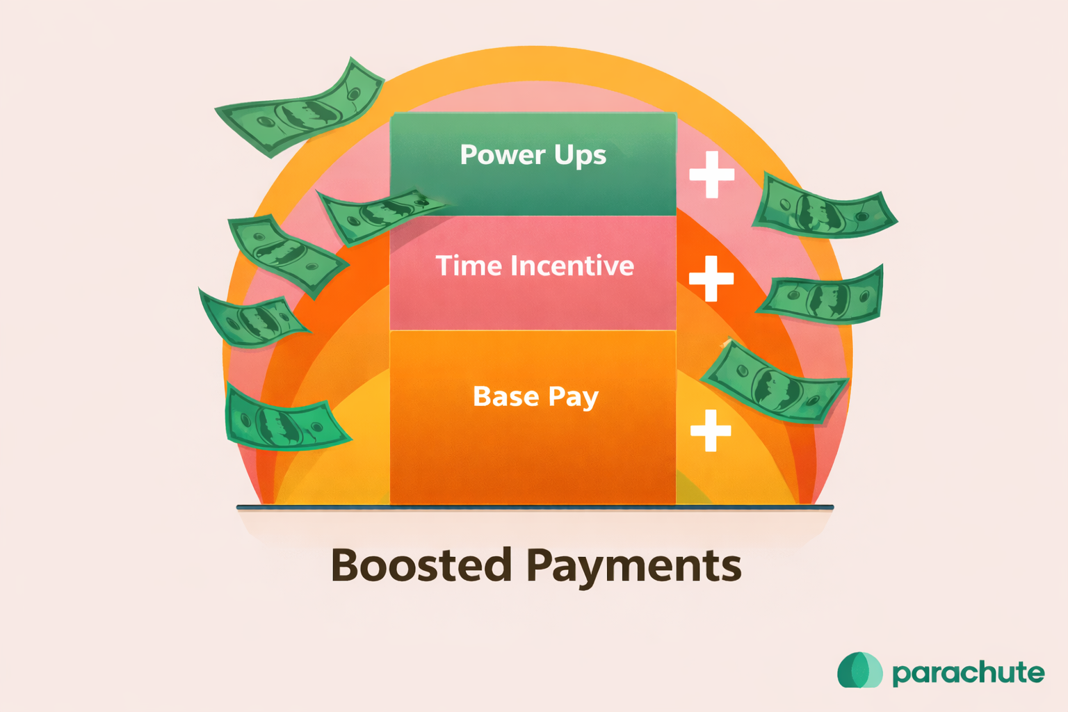 - Power-Ups: Bonus opportunities that stack on top of your base pay. Instead of one hard-to-hit bonus, Parachute offers 6+ bonuses every month.